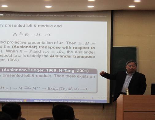 报告中,黄兆泳教授深入细致地讲解了模范畴中与半对偶双模相关的余转置的一些同调性质,并展示了有限维纤维代数上的有限生成模的不可约态射的极小右决定子所构成的集合的基数计算过程。
