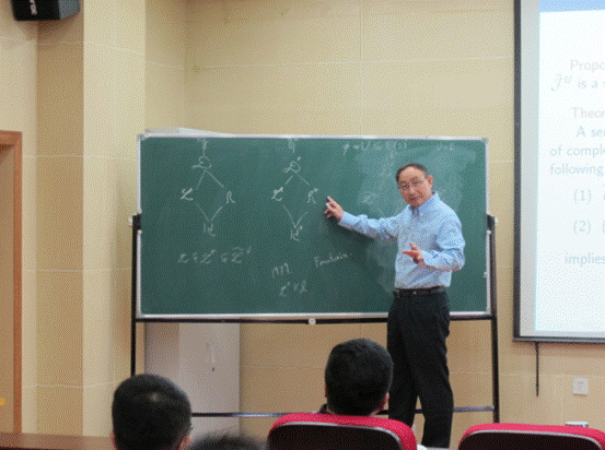 任学明教授以格林关系为核心展开了两堂精彩的报告。首场报告,任学明教授深入细致地讲解了从格林关系到格林*-关系以及广义格林关系的具体推广,并深入阐释了格林关系对半群研究的重要作用。第二场报告,任学明教授重点讲解了Q*-逆半群等半群类的结构,说明了幂等元方法和格林关系及其推广的结合,在半群研究过程中的重要性,并以三视图打比方,将深刻的研究思想讲解的通俗易懂,深入浅出。