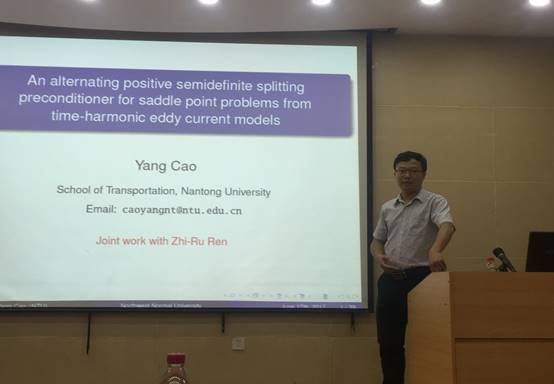 报告中,曹阳副教授介绍了时谐涡流模型的数值离散,并就离散鞍点型块线性系统的迭代求解和预处理Krylov子空间方法进行了详细介绍。报告中曹阳副教授深入地向大家介绍了该领域的系列研究结果、研究现状以及研究前景。