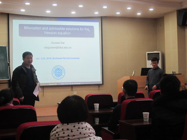 代国伟教授在第一场报告中,主要系统介绍了Hessian 方程的起源和意义,基本研究方法和最新研究成果。在第二场报告中,代国伟教授结合自己最近的工作,详细讲述了如何运用分歧理论研究Hessian 方程。 报告精彩纷呈、深入浅出,对撰写高质量研究论文给出了非常重要的、具有很强指导性的意见,使得在场师生受益匪浅。