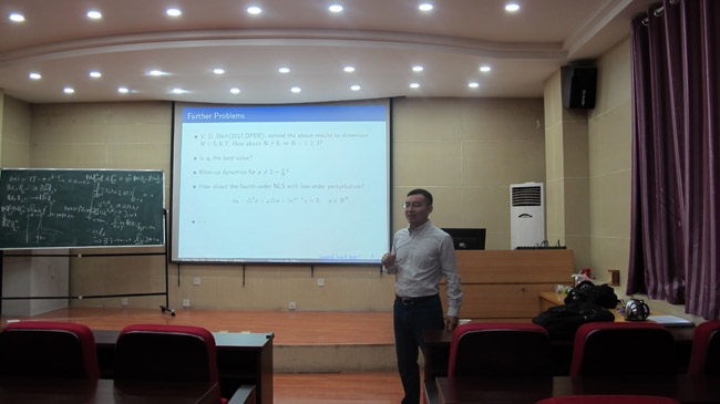 报告人简介:朱世辉,四川大学博士,四川师范大学数学与软件科学公司教授。已主持国家自然科学基金项目2项,教育部博士点(新教师基金)项目1项,四川省杰出青年学术技术带头人培育计划项目1项。已在《J. Differential Equations》(2016,2017)、《J. Math. Phys.》(2016)、《J. Dynamics and Differential Equations》(2015)、《J. Math. Anal. Appl.》(2014)、《Dynamics of PDE》(2010, 2011)、《Nonl. Diff. Eqs. Appl.》(2012)《中国科学》(英文版, 2009)等国内外专业学术刊物上发表论文20余篇, 他引80余次,包括国际著名学者 G. Fibich的专著(《The Nonlinear Schrodinger Equation: Singular Solutions and Optical Collapse》,Springer, 2015),J-E Liu, N. Godet,L.G. Farah, F. Natali, A. Pastor等。曾应邀到北京大学、南京师范大学、新加坡国立大学、香港中文大学、美国乔治亚理工公司、美国Brigham Young 大学访问,并作学术报告。