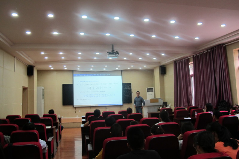 报告会上,吴教授围绕格动力系统、行波解以及整体解等问题汇报了自己近年来的科研工作和成果,并着重讲解了以下研究成果:单稳情形下,首次建立了连接两个平衡点的空间周期解的存在性和渐近行为,从而通过向左和向右的不同速度的行波解可以构造出新的整体解;双稳情形下,通过上下解方法获得了整体解的存在性、唯一性以及Liapunov 稳定性。
