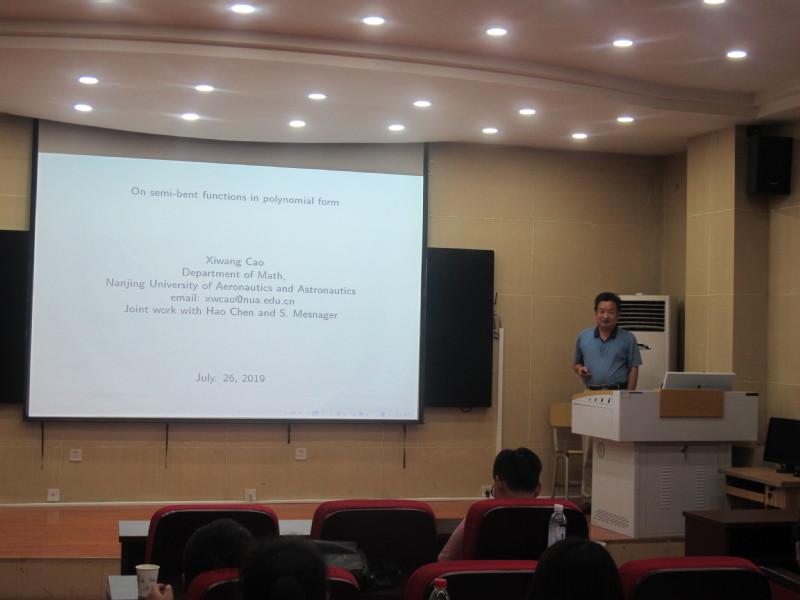 7月26日,应william威廉中文官网邀请,南京航空航天大学曹喜望教授来公司作了题为《On semi-bent functions in polynomial form》的学术报告。报告会由杜小妮教授主持,相关专业师生约20人参加了报告会。