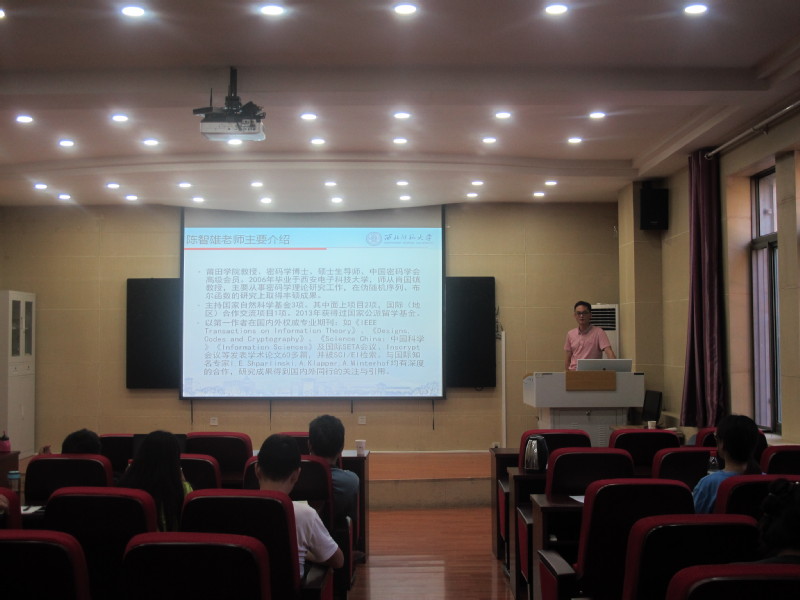 报告中,陈智雄教授首先介绍了构成密码算法的密码函数的背景,总结了布尔函数的许多密码学指标,如平衡性、非线性度、相关免疫性,系统讲述了Walsh谱、q-变换、q-bent函数的相关性、偏差集等基本概念、计算以及一些猜想,并就现有的研究成果给同学们分享了自己的见解,最后提出了进一步研究的问题。