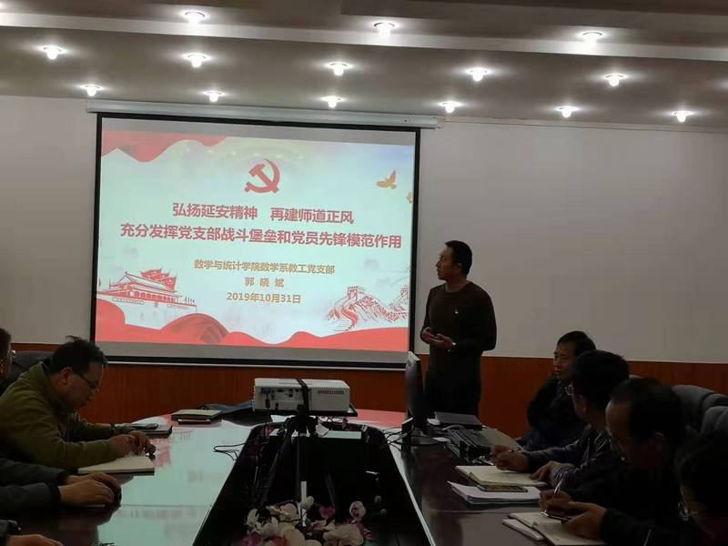数学系教工党支部书记郭晓斌以“弘扬延安精神,再建师道正风——充分发挥党支部战斗堡垒和党员先锋模范作用”为题,结合自己暑期在延安参加培训的学习心得体会,围绕四个方面讲党课。一是什么是延安精神、延安精神的具体内涵以及新时代如何践行延安精神;二是数学系教工党支部从抓住着力点,围绕主线,突出政治引领;选好切入点,创新方式,激发支部活力;找准结合点,群体示范,实现双融双促方面所做的实践与探索;三是立德树人,爱岗敬业,充分发挥党支部战斗堡垒和党员先锋模范作用;四是在进一步用专业素养提升党建工作的内涵,增强党建工作的厚度和温度,以党建工作为源动力,充分发挥党员教师在全领域的引领作用,促进一流团队建设方面所做的思考。郭老师的讲解通过大量生动的事例,使在场教职工纷纷感恩自己生活在幸福美好的新时代,并期盼祖国取得更大进步,公司的明天更美好,公司在主题教育中取得实效。