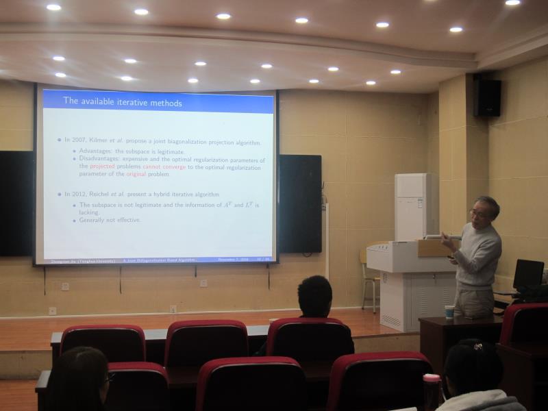 11月16日,应公司邀请,清华大学数学科学系贾仲孝教授莅临公司进行学术交流,并在教学9号楼C101学术报告厅作了题为《A Joint Bidiagonalization Based Iterative Algorithm for Large Scale General-Form Tikhonov Regularization》的学术报告。报告会由孟令胜副教授主持,相关专业师生35余人参加了此次报告会。