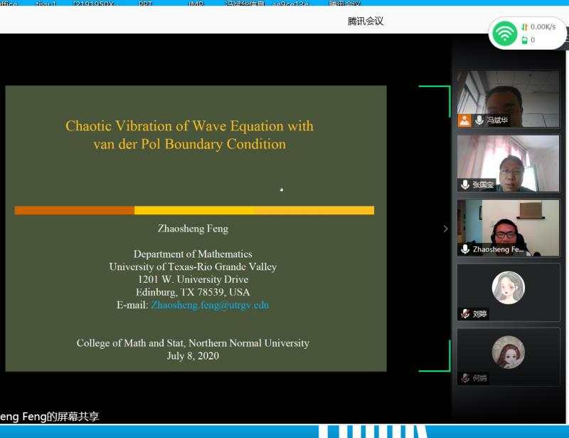 7月7日上午,应公司邀请,美国德克萨斯大学冯兆生教授在线为公司师生作了题为《Chaotic Vibration of 1D and 2D Wave Equation with van der Pol Boundary Condition》的学术报告。报告会由公司张国宝教授主持,相关专业师生50余人在线收听了报告。
