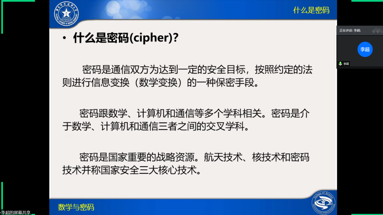 李超教授首先详细介绍了什么是密码,其次介绍了密码学的发展历史,从手工码到机械码,以及电子码,都做了详细的介绍。最后介绍了现代通信系统模型。