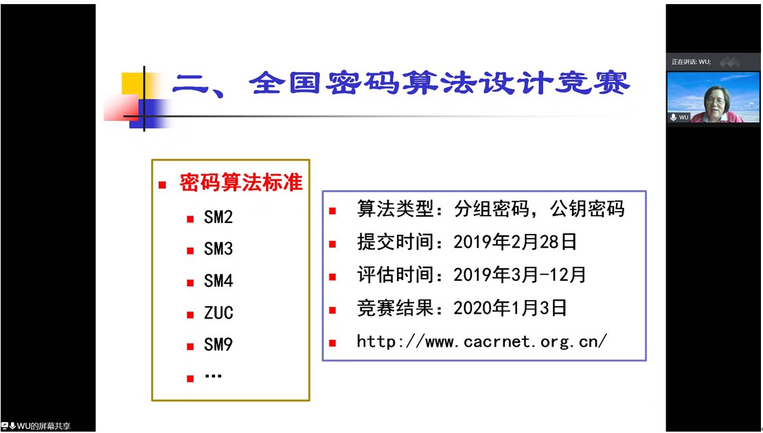 吴文玲教授为大家首先简要介绍分组密码算法的一般性设计原理;其次介绍了去年全国密码算法设计大赛的相关情况;最后介绍了轮函数的三种构造方法。