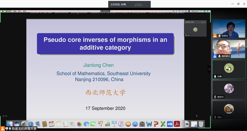 9月17日,应william威廉中文官网邀请,东南大学数学公司陈建龙教授,在线作了题为《Pseudo core inverses of morphisms in an additive category》的学术报告。报告由狄振兴副教授主持,相关专业师生50余人参加了学术报告。