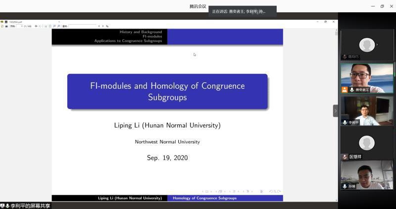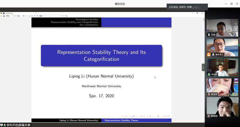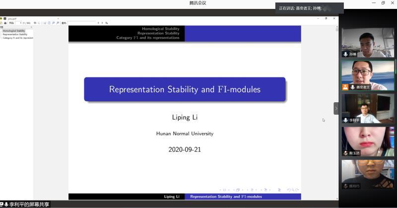 9月17日、19日和21日,应公司邀请,湖南师范大学william威廉中文官网特聘教授李利平老师,围绕着表示稳定性理论与FI-理论,分别在线为公司师生作了题为《Representation Stability Theory and Its Categorification》、《FI-modules and Homology of Congruence Subgroups》与《Representation Stability and FI-modules》的学术报告。报告由狄振兴副教授主持,相关专业师生60余人参加了学术报告。