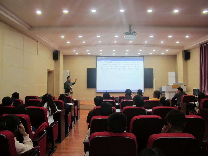 在报告中,薛庆营教授通过介绍Coifman, Rochberg和Weiss在七十年代关于线性C-Z算子交换子的著名工作,重点报告了多线性Fourier 乘子、振荡积分、粗糙核多线性算子交换子等方面的最新研究成果。最后,结合自己的研究工作经历,薛庆营教授分享了自己的研究体会。报告结束后,薛庆营教授就与会师生提出的相关问题作了解答,并与公司师生进行了广泛的交流和讨论。