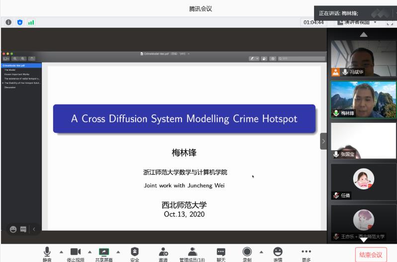 10月13日,应公司邀请,浙江师范大学梅林锋教授在线为公司师生作了题为《Existence and stability of spike solutions for a chemotaxis system modelling crime pattern formation》的学术报告。报告会由冯斌华副教授主持,相关专业师生50余人参加了此次报告会。