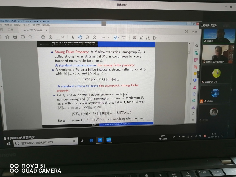 黄建华教授主要介绍了带阻尼的高阶KdV方程和Ostrovsky方程在高斯噪声和纯跳噪声下不变测度的存在性和唯一性。其解在H^1(R)和L^2(R)中的一致估计是弱耗散系统在R上遍历性的关键,数值模拟支持了理论分析结果。最后介绍了随机流体类发展方程在空间谱Galerkin离散、时间指数Euler离散后不变测度的收敛阶。