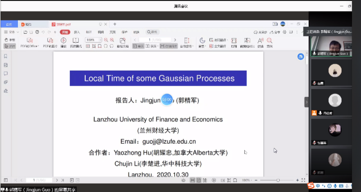 10月31日,应公司邀请,兰州财经大学统计公司郭精军教授在线为公司师生作了题为《Local Time of some Gaussian Processes》的学术报告。报告由冯德成副教授主持,相关专业师生30余人参加了学术报告。