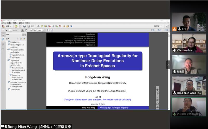 11月7日下午,应公司邀请,上海师范大学王荣年教授在线为公司师生作了题为“Aronszajn-type Regularity for Nonlinear Evolution Equations with Multi-valued Perturbations”的学术报告。报告会由杨和副教授主持,相关专业师生30余人参加了报告会。