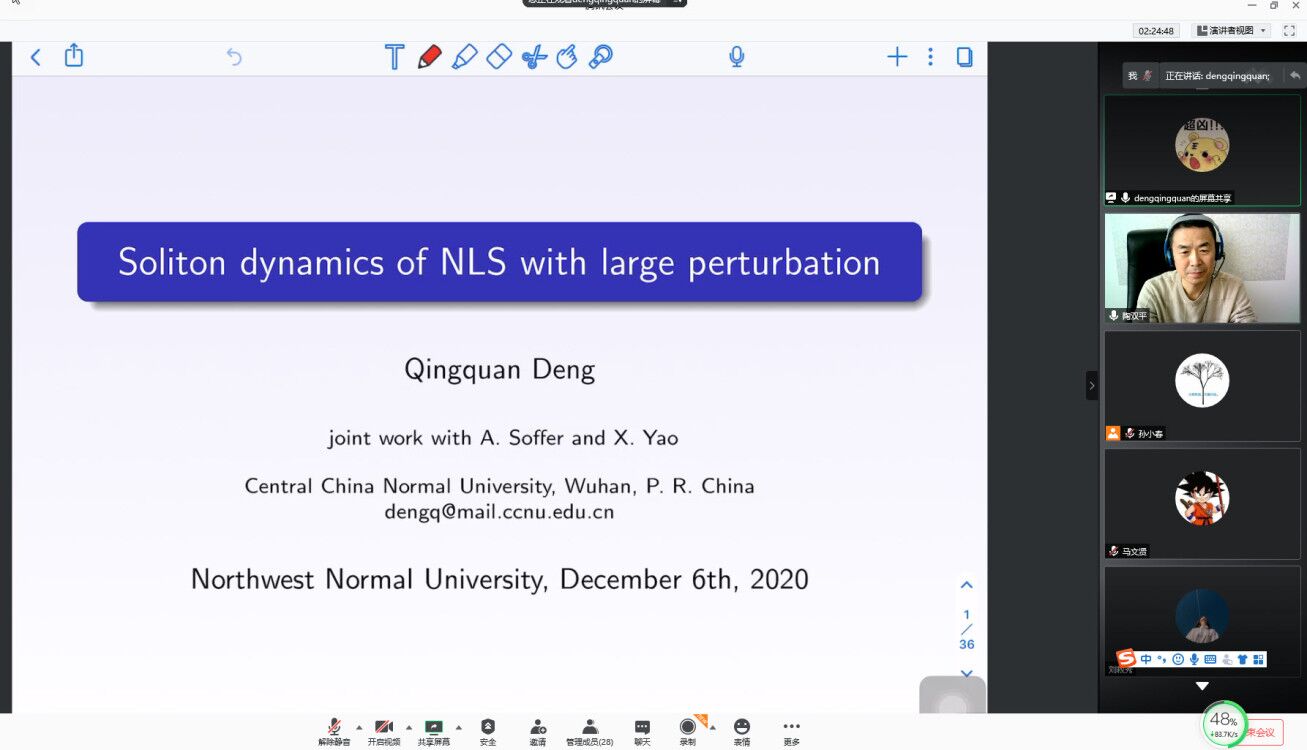 12月6日,应公司邀请,华中师范大学邓清泉副教授在线为公司师生作了题为《Soliton dynamics for NLS with large perturbation》的学术报告。报告会由陶双平教授主持,相关专业师生50余人参加了此次报告会。