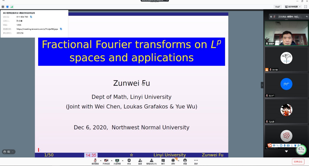 12月6日,应公司邀请,临沂大学傅尊伟教授在线为公司师生作了题为《Fractional Fourier transforms on Lp and applications》的学术报告。报告会由陶双平教授主持,相关专业师生50余人参加了此次报告会。