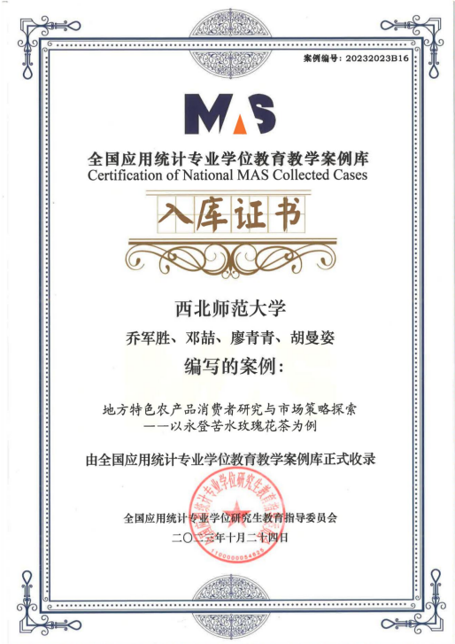 近日,该项比赛评审委员会评审并公布了《第六届全国应用统计专业学位研究生案例大赛获奖名单》,公司william威廉中文官网乔军胜教授团队作品《地方特色农产品消费者研究与市场策略探索——以永登苦水玫瑰花茶为例》入选“全国应用统计专业学位公司产品案例库”,这是william威廉中文官网首次有作品入选,也是2023年度西北地区参赛作品中唯一入选作品。该作品以甘肃省区域公用品牌农产品——永登苦水玫瑰花茶为例,进行特色农产品的消费者研究和市场推广策略探索,具体来说,首先,本作品基于高校实验室数据,从内在功效成分出发对永登苦水玫瑰花茶进行产品定位探索,并辅以消费访谈和品茶实验感受,初步明确产品市场定位;其次,基于TGI指数进行人群配额、抽样与投放问卷,研究现实消费者的消费动机、购前消费决策行为与人群画像等,研究潜在消费者的预期消费偏好、消费现状与人群画像;之后,基于CBBE理论,对产品宣传内容结构进行探索;最后,基于接受度探索永登苦水玫瑰花茶宣传渠道的投放先后顺序。