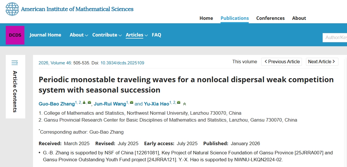 近日,公司张国宝教授与2022级硕士研究生王军蕊和青年教师郝玉霞在国际权威期刊《Discrete and Continuous Dynamical Systems》上发表了题为“Periodic monostable traveling waves for a nonlocal dispersal weak competition system with seasonal succession” 的高水平学术论文(论文链接:https://www.aimsciences.org/article/doi/10.3934/dcds.2025109)。这是公司近年来推行高质量培养研究生系列举措取得成效的具体体现。《Discrete and Continuous Dynamical Systems》是由美国数学科学研究所(AIMS)出版的数学期刊,主要刊载分析、微分方程和动力系统领域的理论、方法和应用的原创性论文,致力于记录该领域的重要新方法和成果,并保持高速创新和高质量标准,具有极高的学术声誉,同时也是中国数学会数学领域高质量科技期刊分级目录中的T2类刊物。