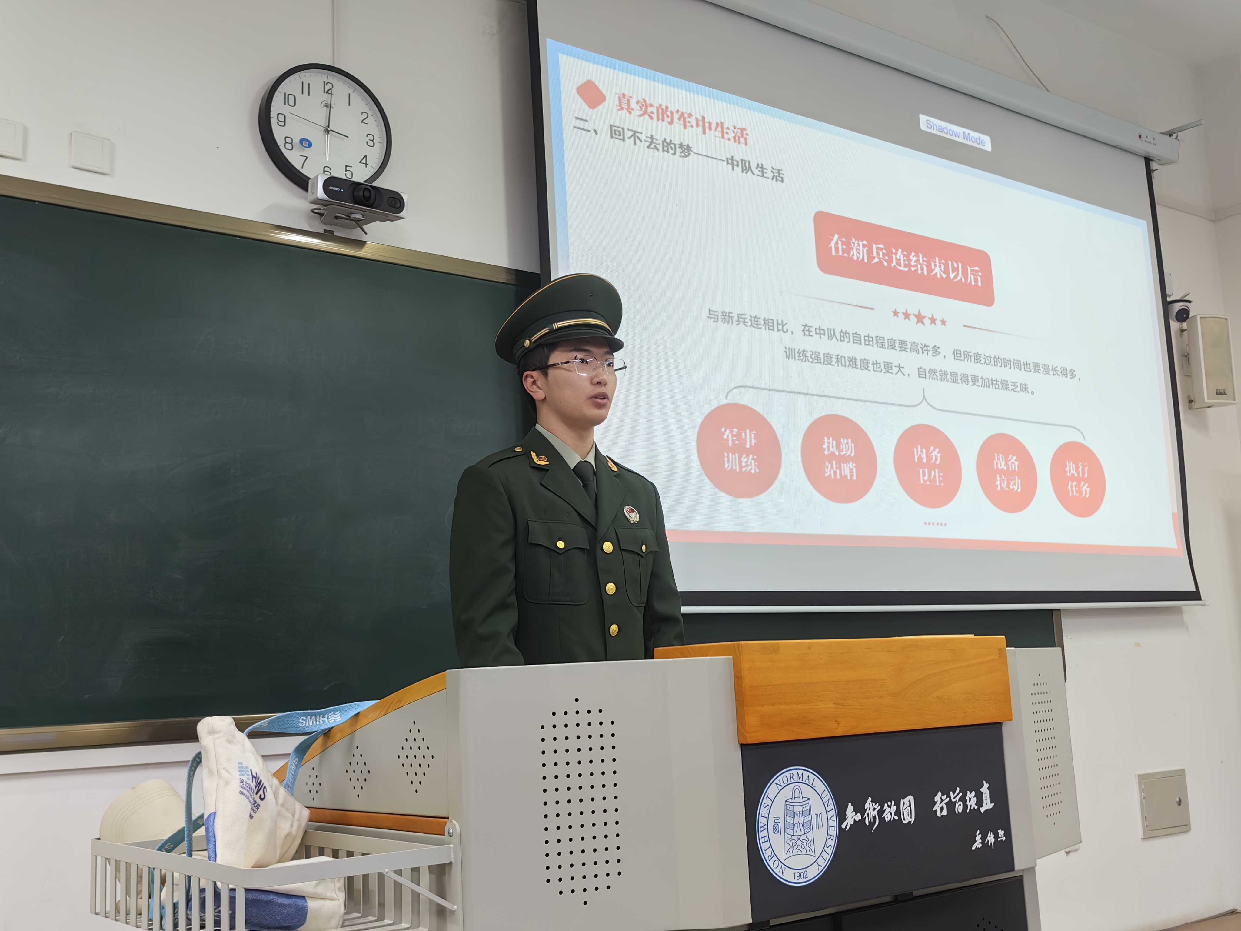 分享会上,2023级应数4班古丽阿依姆·如则、2024级应数1班冯超、2024级应数2班马亚蓉、2025级应数2班陈彤新等4名优秀退伍员工代表结合亲身经历,生动展现了从军营回到校园的蜕变历程。会上,4位优秀退伍老员工从为什么要参军、军营的日常生活、个人的体验、成长和收获、入伍应具备的条件等方面进行了分享。